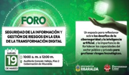 Ante el avance acelerado de la tecnología que transforma la gestión pública y privada, la Gobernación de Risaralda realizará el Foro de Seguridad de la Información y Gestión de Riesgos en la Era de la Transformación Digital, un espacio de encuentro para pensar cómo proteger el conocimiento, los datos y los sistemas que hoy sostienen gran parte de la vida institucional.